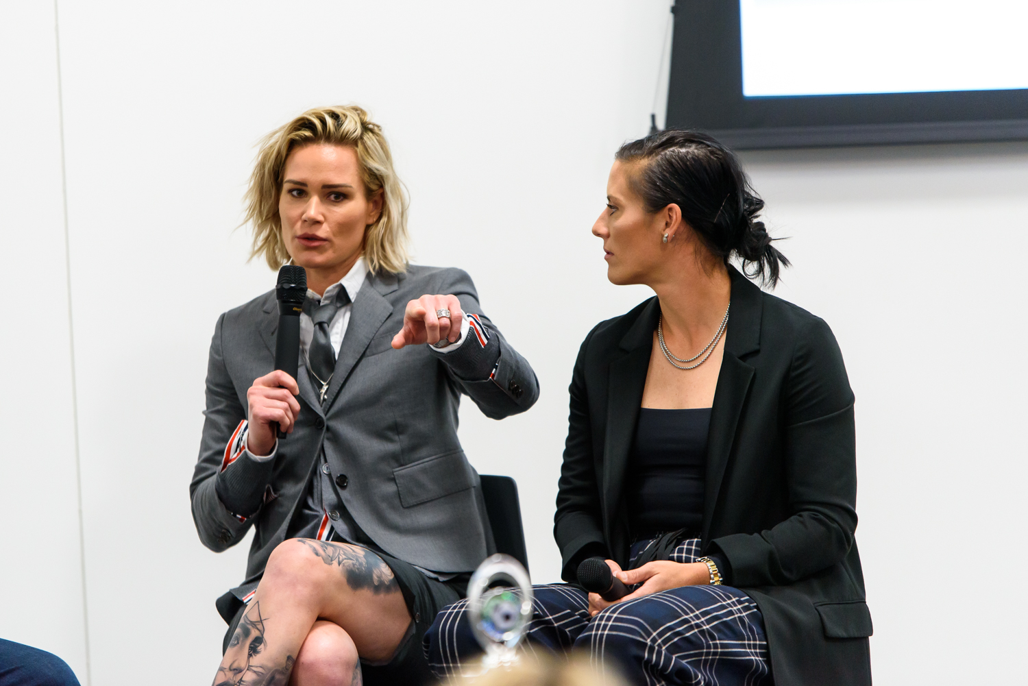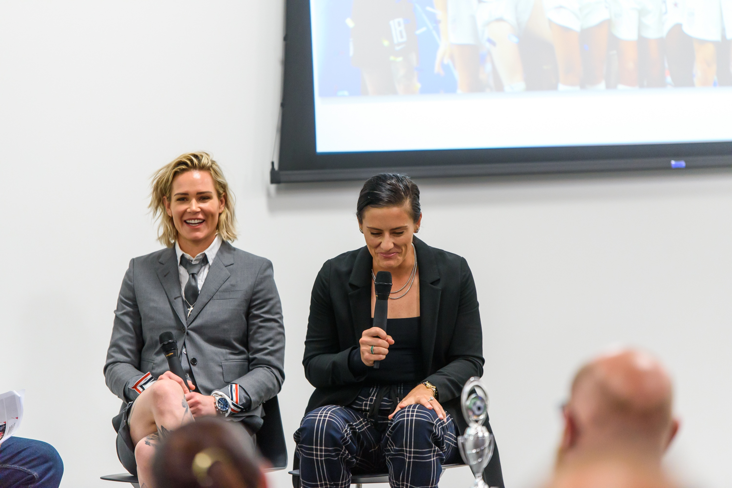 Special Guests Ali Krieger and Ashlyn Harris of the United States Women's National Soccer Team share a few words at the Co-Owner Sessions